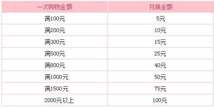 用戶一次購物金額超過100元即可參與積分兌換現(xiàn)金券活動(dòng),所得現(xiàn)金券在下次購物時(shí)可支付商品金額及配送費(fèi),用戶應(yīng)補(bǔ)齊購物費(fèi)差額部分。
